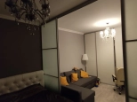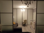 В большой комнате 20м сделано зонирование на спальню и гостевую с помощью перегородок из матового стекла, что придаёт особый колорит и удобство. В шарфу - купе предусмотрено рабочее место, что также очень удобно. Во второй комнате 14 м расположен большой и вместительный распашной шкаф. Однотонный цвет стен и пол выполнены в светлых тонах, что придаёт спокойную и уютную атмосферу в доме.