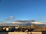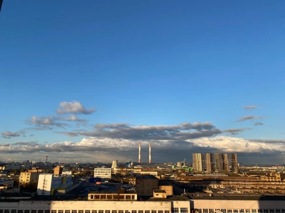 Впечатляющий панорамный вид на город. Под окнами зелёный сквер с фонтаном.
